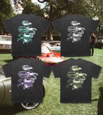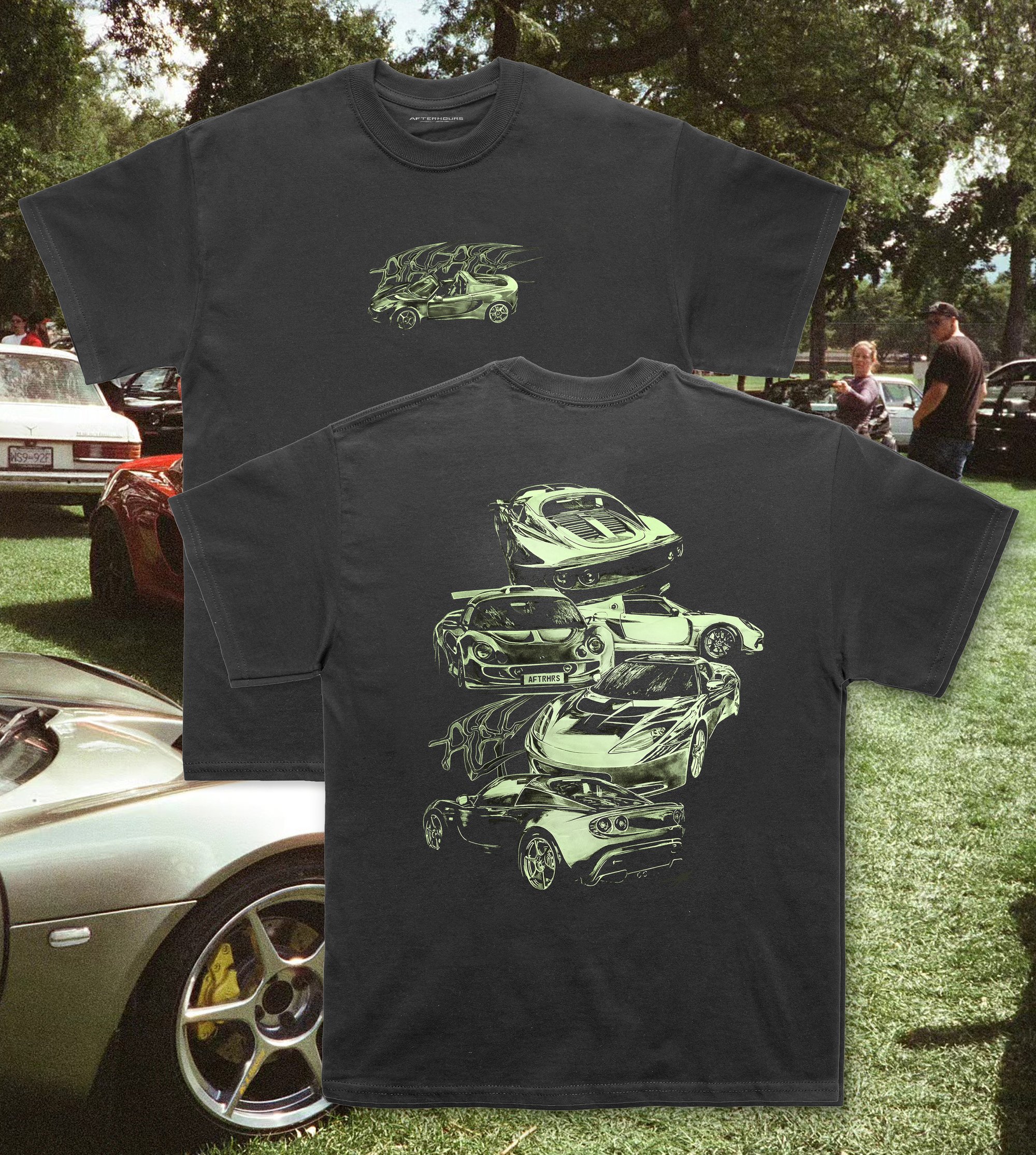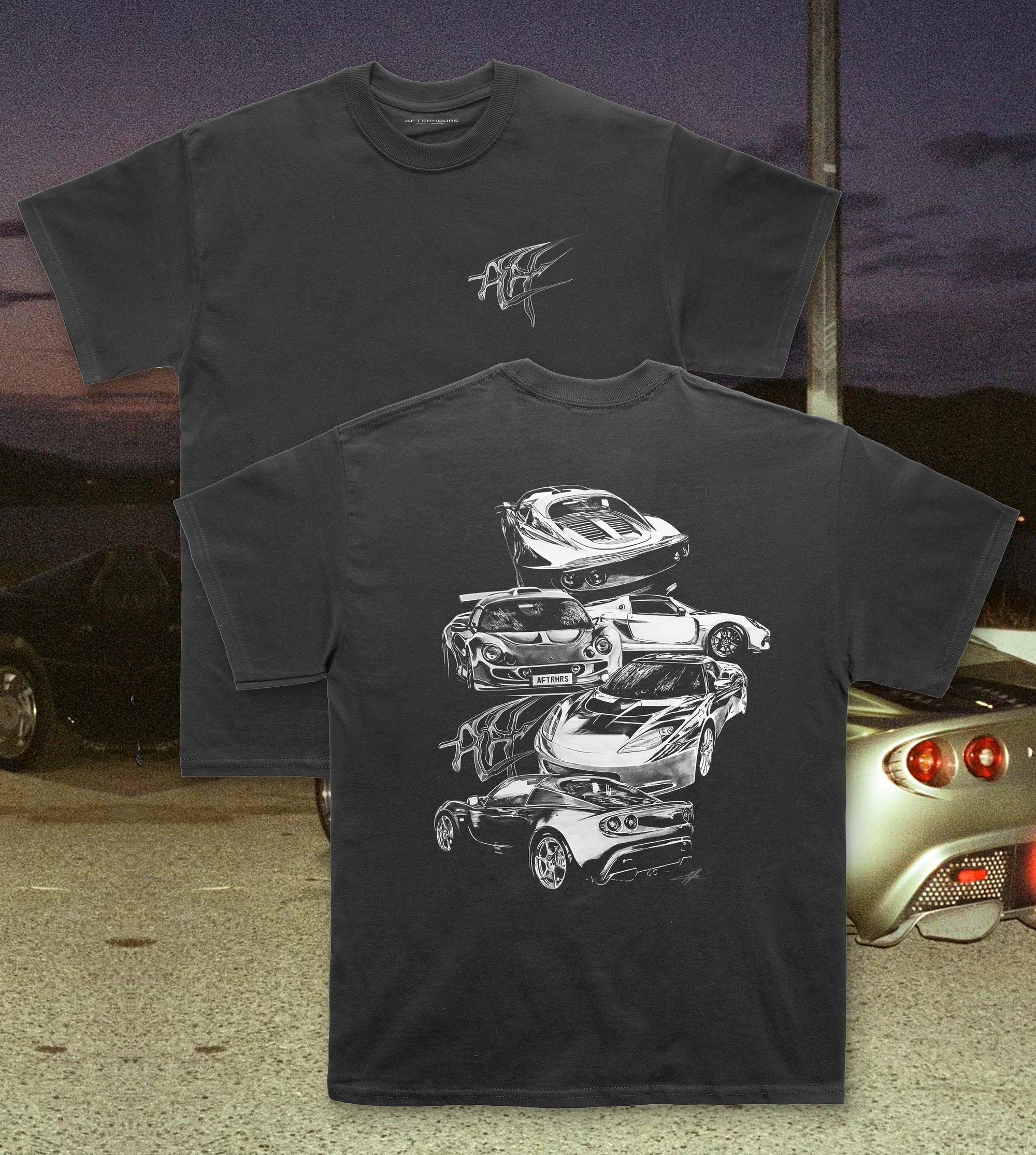 Hand drawn art-tee collab by Natasha Halchuk & Mason Kowbel showcasing 4 generations of Lotus cars.